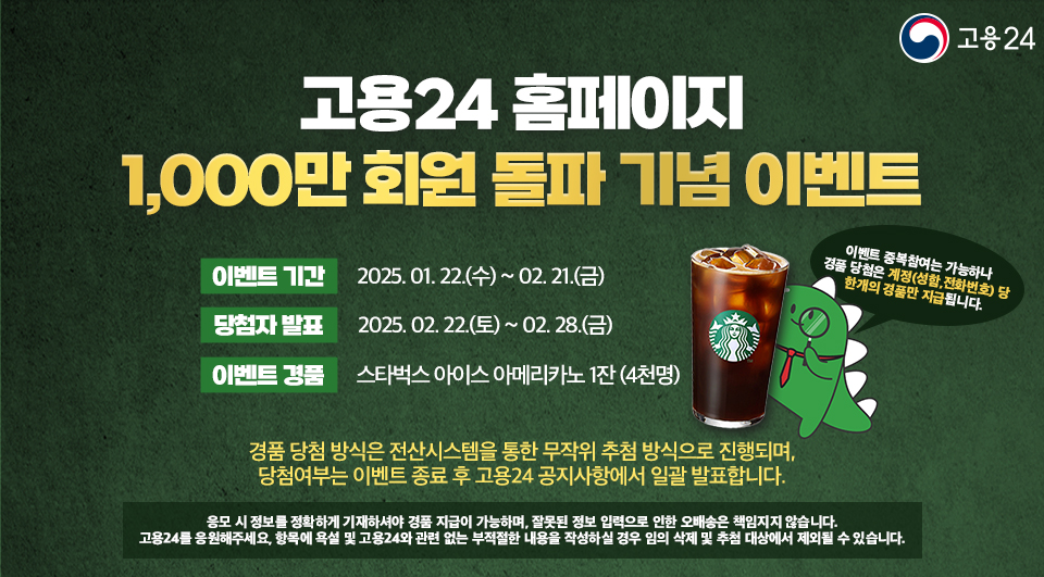 고용24의 천만 회원 돌파와 관련된 공식 공지 및 이벤트에 대한 자세한 정보는 고용24 공식 웹사이트에서 확인할 수 있습니다. 이벤트 참여를 위해서는 고용24 로그인 후, 이벤트 페이지에서 제공하는 지침을 따르면 됩니다. 경품은 참여자 중 추첨을 통해 제공되며, 당첨자는 개별 통보됩니다.