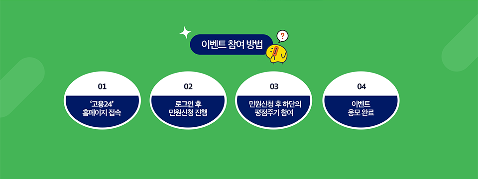 고용24 이벤트에 참여해주셔서 감사합니다. 아래 내용을 작성해주시면 고용24 운영에 많은 도움이 됩니다. 구직신청 구직신청 실업급여 실업급여 직업훈련 직업훈련 국민취업지원제도 국민취업